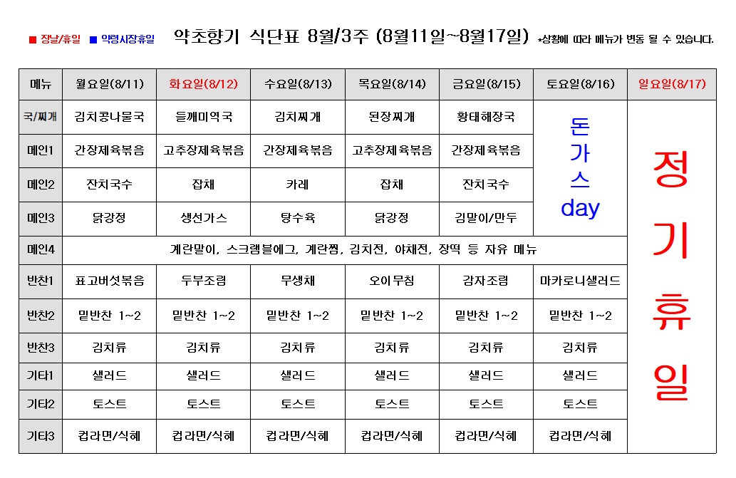 일주일 식단표 (08월11일~08월17일)