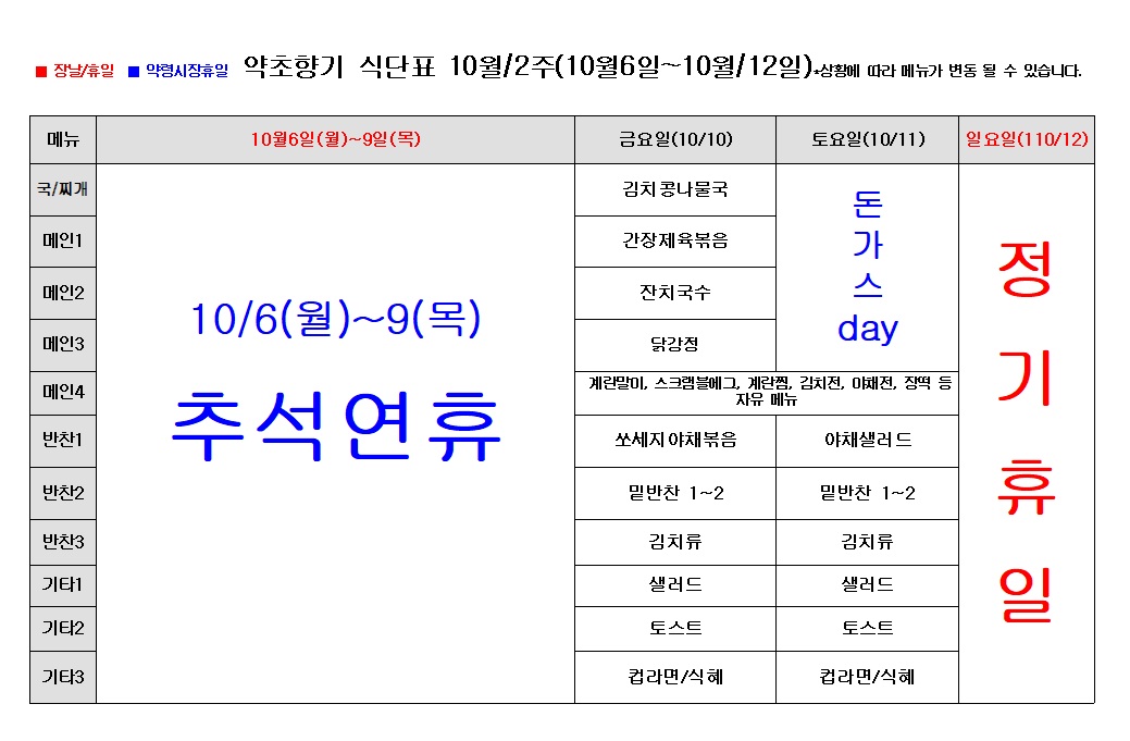 일주일 식단표 (10월10일~10월11일)