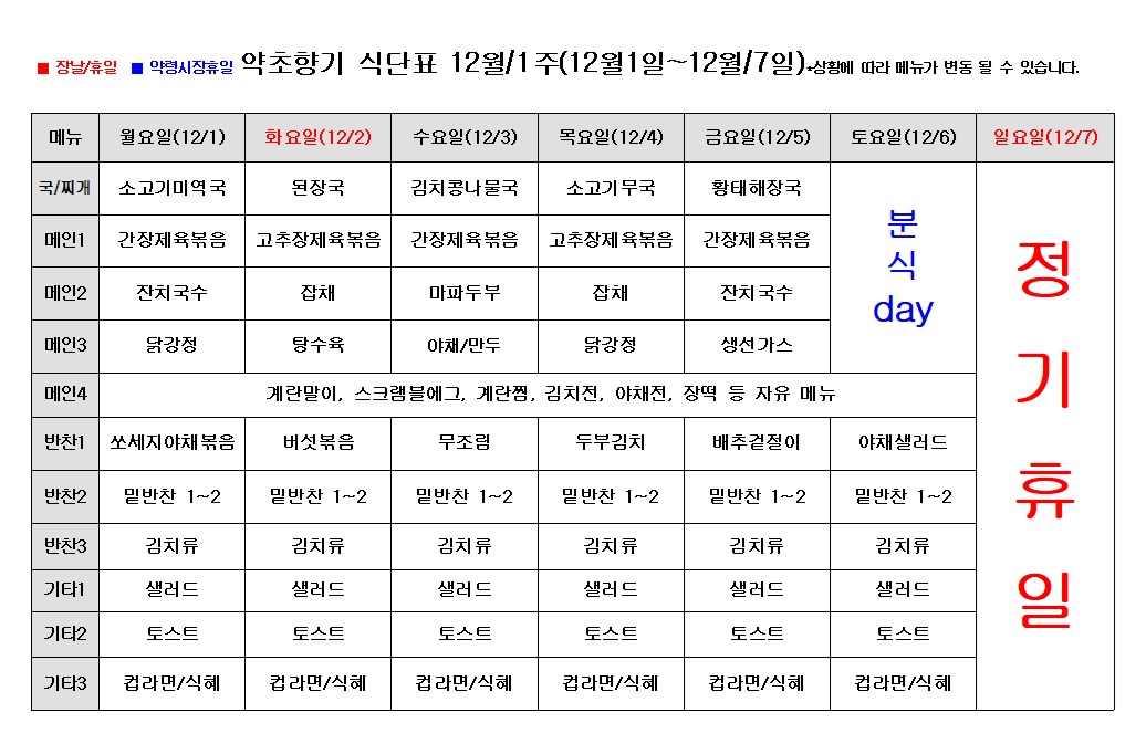 | [약초향기] 7,000원 한식뷔페 - 일주일 식단표 (12월15일~12월21일) (11) | 2025.12.15 |