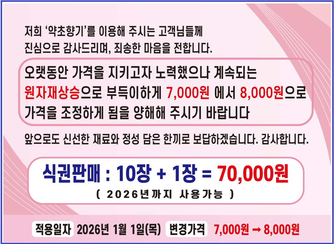 2026년 1월 1일 부터 7,000원에서 8,000원을 가격이 인상됨을 알려 드립니다.